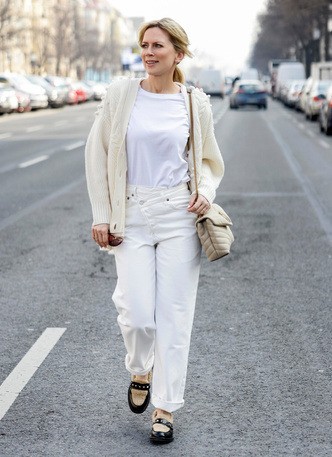 • Летом тоже случаются прохладные дни и вечера. Пушистый укороченный свитер придется кстати в такую погоду. Если свитер длиннее, заправьте его передний край в джинсы, остальную длину оставьте без изменений. Белые кеды или туфли с квадратным носом прекрасно дополнят комплект.